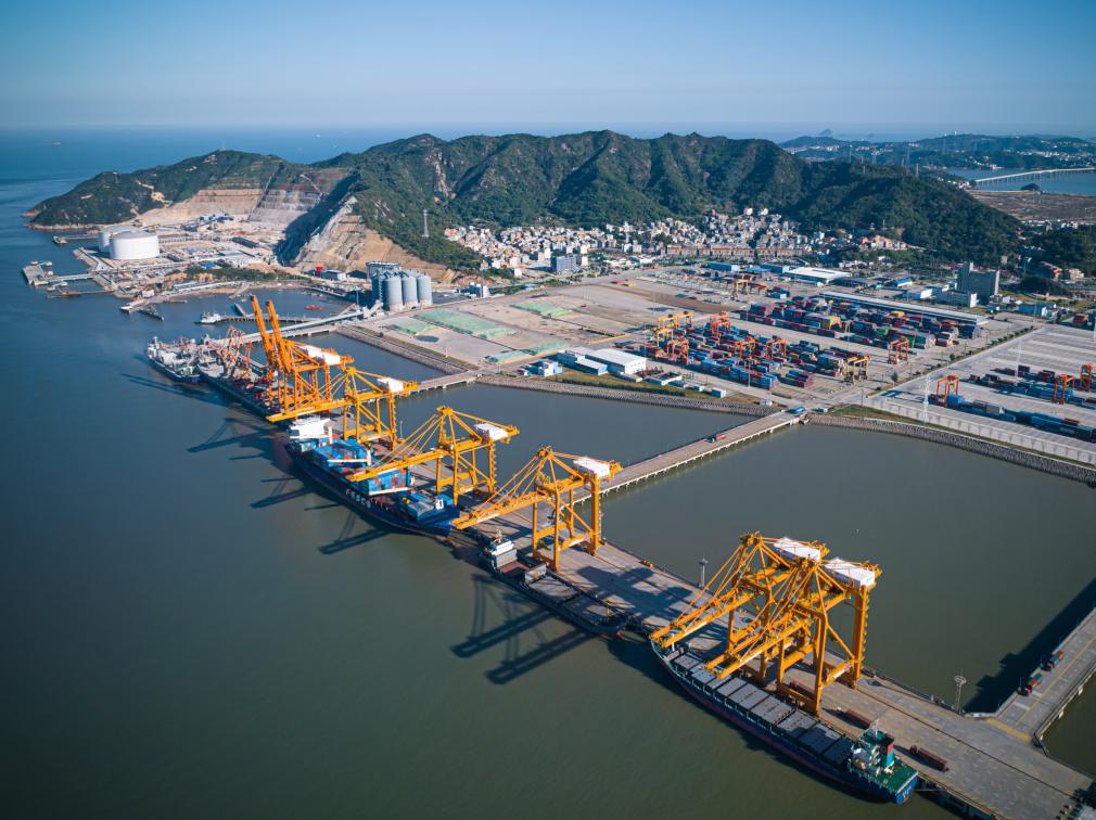 貨輪停靠在溫州港狀元岙集裝箱碼頭卸載集裝箱(無(wú)人機(jī)照片)。新華社記者江漢 攝