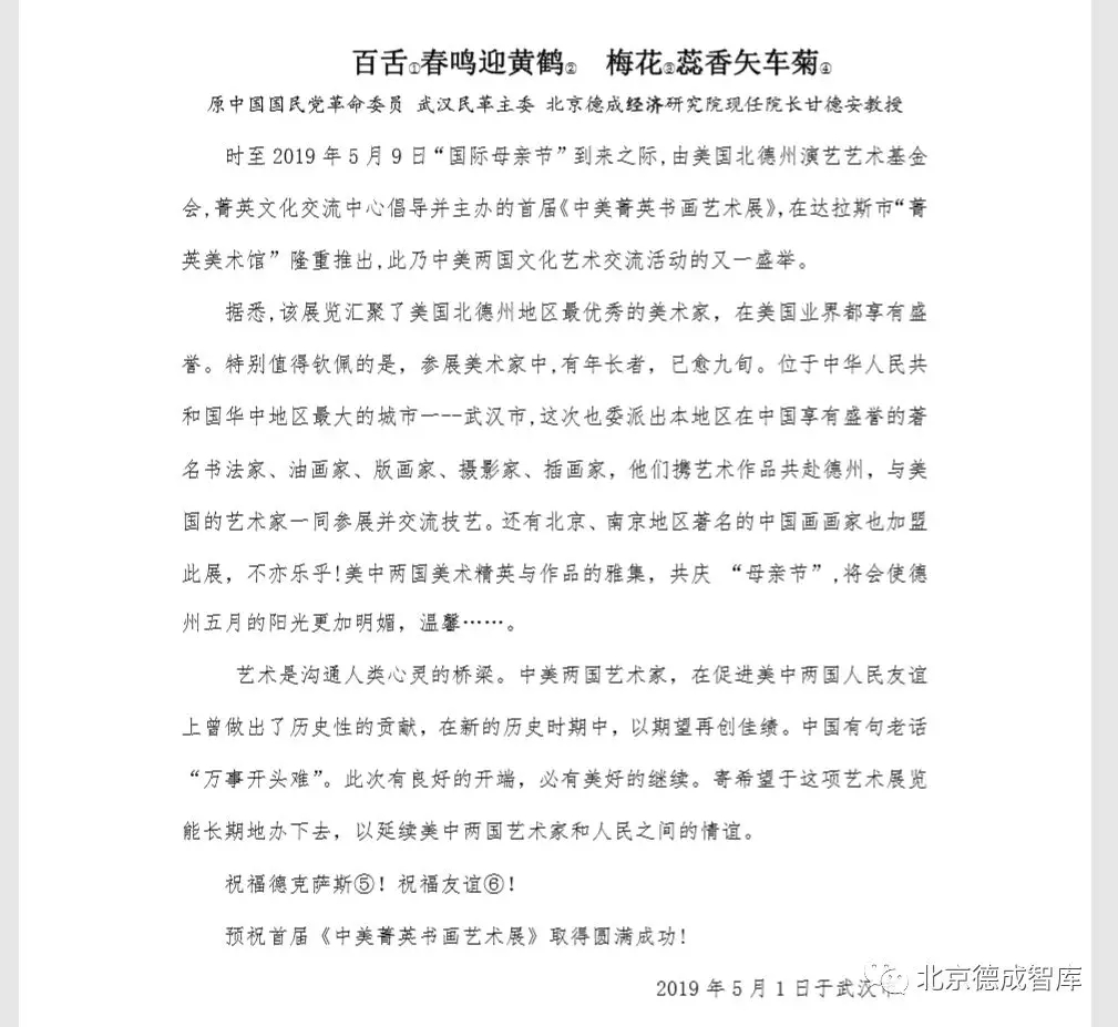 2019是中美建交四十周年,我院藝術(shù)總監(jiān)周勇先生(著名攝影家)與美國(guó)華裔著名音樂(lè)家汪大衛(wèi)先生為慶祝這充滿和平的偉大時(shí)代刻,共同策劃了首屆《中美菁英書(shū)畫(huà)藝術(shù)展》,在美國(guó)達(dá)拉斯市國(guó)際母親節(jié)的盛宴中與《菁英母親節(jié)交響音樂(lè)會(huì)》同期開(kāi)幕。東西方書(shū)畫(huà)藝術(shù)邂逅交響樂(lè),一場(chǎng)藝術(shù)的跨界,一群優(yōu)秀中美藝術(shù)家的雅集......在達(dá)拉斯市成為藝術(shù)家、成為人們之間熱點(diǎn)關(guān)注的話題。美國(guó)聯(lián)邦眾議會(huì)、達(dá)拉斯政府、李察市政府、當(dāng)?shù)孛襟w紛紛為藝術(shù)跨界的活動(dòng)點(diǎn)贊,并舉辦了表彰儀式,湖北日?qǐng)?bào)、騰訊、大楚網(wǎng)、湖北政務(wù)官網(wǎng)長(zhǎng)江云、武漢政務(wù)官網(wǎng)黃鶴云也紛紛對(duì)此報(bào)道.中美各界對(duì)本次藝術(shù)融合帶來(lái)的和平繁榮表示著衷心的祝賀!