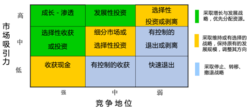 通用矩陣法又稱行業(yè)吸引力矩陣、九象限評價法,是美國通用電氣公司設(shè)計的一種投資組合分析方法。它是一種守住有競爭優(yōu)勢并盈利的主業(yè)的一種方法,也是多元化企業(yè)集團產(chǎn)業(yè)選擇的方法。它運用加權(quán)評分方法分別對企業(yè)各種產(chǎn)品的行業(yè)引力(包括市場增長率、市場容量、市場價格、利潤率、競爭強度等因素)和企業(yè)實力(包括生產(chǎn)能力、技術(shù)能力、管理能力、產(chǎn)品差別化、競爭能力等因素)進行評價,按加權(quán)平均的總分劃分為大(強)、中、?。ㄈ酰瑥亩纬?種組合方格以及3個區(qū)域,如圖表5所示。