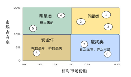 波士頓矩陣分析法是通過以上兩個因素相互作用,會出現(xiàn)四種不同性質(zhì)的產(chǎn)品類型,形成不同的產(chǎn)品發(fā)展前景:一是銷售增長率和市場占有率“雙高”的產(chǎn)品群(明星類產(chǎn)品);二是銷售增長率和市場占有率“雙低”的產(chǎn)品群(瘦狗類產(chǎn)品);三是銷售增長率高、市場占有率低的產(chǎn)品群(問號類產(chǎn)品);四是銷售增長率低、市場占有率高的產(chǎn)品群(現(xiàn)金牛類產(chǎn)品),見圖表6。