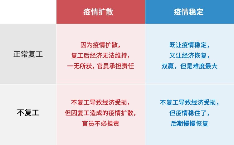 所以說,“復工+疫情穩(wěn)定”是最好結果,但最難實現。所以許多地方傾向于選擇“次優(yōu)選擇”,就是“不復工+疫情穩(wěn)定”。這樣相對難度較小,結果也會不錯。