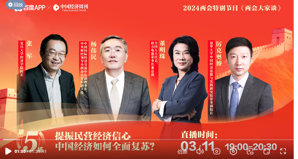 2024年全國兩會(huì),中國經(jīng)濟(jì)周刊聯(lián)合百度APP,攜手代表委員、學(xué)者型官員、商界領(lǐng)袖、經(jīng)濟(jì)學(xué)家、行業(yè)專家,推出《兩會(huì)大家談》系列直播,旨在通過專業(yè)的探討,分析現(xiàn)象背后的本質(zhì)。本期關(guān)注民營經(jīng)濟(jì)話題。今年,中國的經(jīng)濟(jì)增長目標(biāo)定為5%左右,要想達(dá)到5%左右的經(jīng)濟(jì)增速,可能會(huì)面臨哪些困難,應(yīng)該如何應(yīng)對(duì)?民營經(jīng)濟(jì)一直是我國經(jīng)濟(jì)的重要組成部分,對(duì)于正在推動(dòng)的《民營經(jīng)濟(jì)促進(jìn)法》,有何建議和期待...